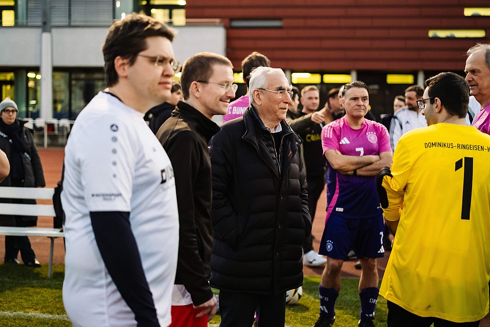 Bereits einen Tag zuvor hatte die Ursberger Fußballmannschaft den sportlichen Höhepunkt der Reise absolviert: Ein Freundschaftsspiel gegen den FC Bundestag im Cantianstadion. Sowohl der Besuch im Kanzleramt als auch das Fußballmatch wurden maßgeblich von Theo Waigel organisiert. Der frühere Bundesfinanzminister, der bis heute in Berliner Kreisen gut vernetzt ist, ließ es sich als Ehrenspielführer der Ursberger Fußballmannschaft nicht nehmen, den symbolischen Anstoß persönlich vorzunehmen. Es war das zweite Spiel dieser Art: Bereits in den 1990er Jahren war das DRW-Team zu Gast in Berlin, ebenfalls in Begleitung von Theo Waigel, der damals noch selbst auf dem Platz stand.