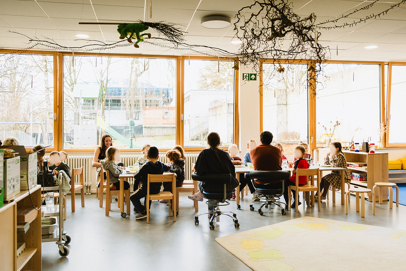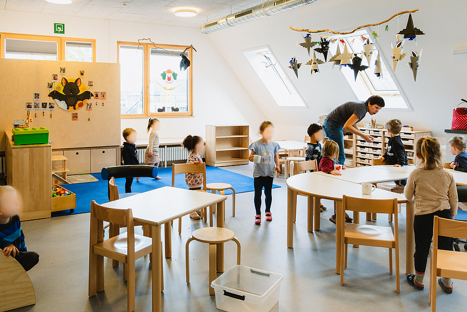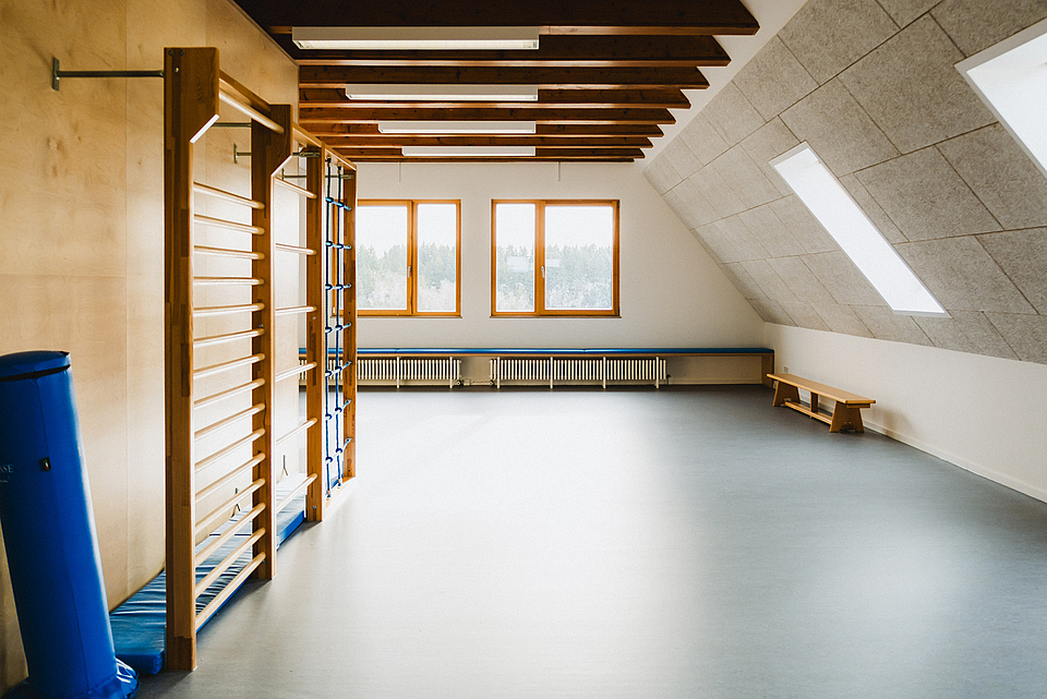 Die neuen Räumlichkeiten sind durch den Ausbau des bisher nicht genutzten Dachgeschosses entstanden. Dort befindet sich neben einem Gruppenraum auch die neu gestaltete Turnhalle mit Kletter- und Sprossenwand. Im Untergeschoß fand ein weiterer Gruppenraum in der bisherigen Turnhalle Platz, der über einen direkten Zugang in den Garten verfügt.