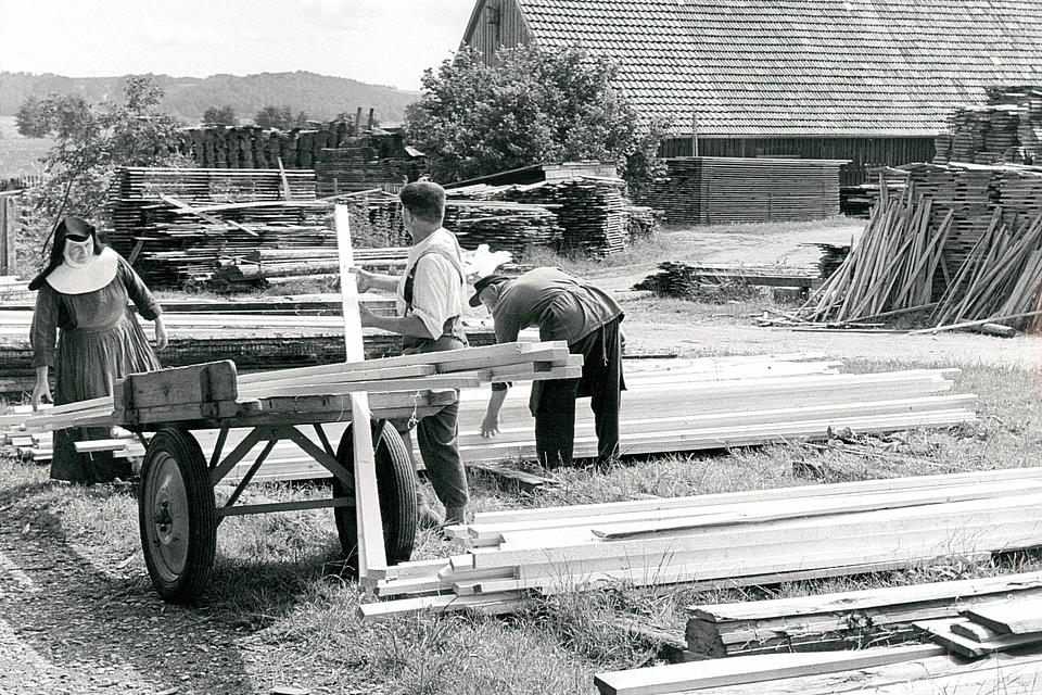 Ob nun Schwester M. Cassiana, die 43 Jahre lang den sehr ansehnlichen Pferdestall des Klosters versorgte, oder Schwester M. Dafrosa, die auf ihrem stets palmstraußgeschmückten Moped zwischen ihren Arbeitsstelle Elektrizitätswerk und Baubetrieb hin und her pendelte, stets umgab die Schwestern eine herzliche Zufriedenheit, die aus ihrem täglichen Tun sprach. So zumindest ist es den jeweiligen Nachrufen zu entnehmen und dem Wunsch eines Bewohners, der meinte: „Der Schwester Cassiana sollte man einen goldenen Sarg machen.“ Ob Molkerei, Sägewerk, Schreinerei oder Baubetrieb, im Kloster spielten Zuschreibungen „männlicher“ oder „weiblicher“ Begabungen keine Rolle. Die Schwestern übernahmen Verantwortung in allen Arbeitsbereichen und eröffneten sich Bildungs- und Berufswege, die Frauen außerhalb der Klostermauern noch lange verschlossen blieben. Bei aller beruflicher Selbstverwirklichung fühlten die Schwestern sich immer im Einklang mit ihrer klösterlichen Berufung. Oder könnte man es schöner sagen als Schwester M. Tilbert, die in ihrer Hausarbeit zur Gärtnermeisterprüfung schrieb: „Gärtnerwerk ist heiliges Tun… Leib und Seele werden vom Gärtner zusammengehalten… Das macht Freude und Freude ist gesund.“