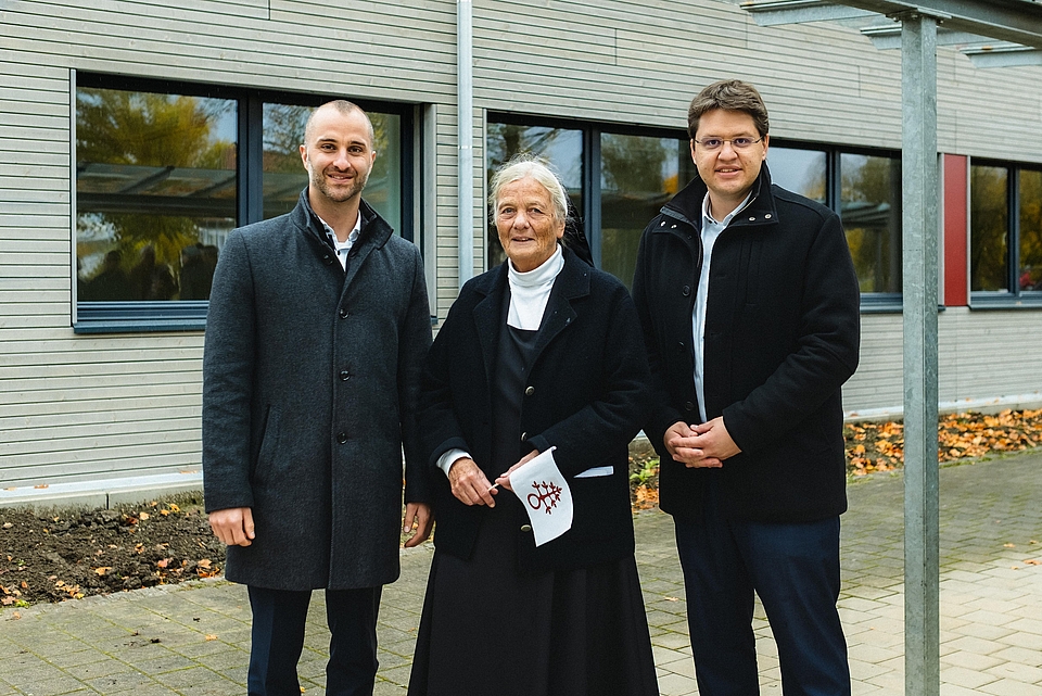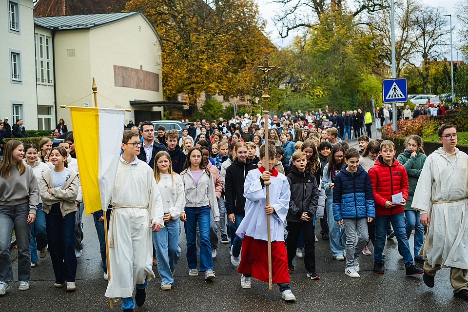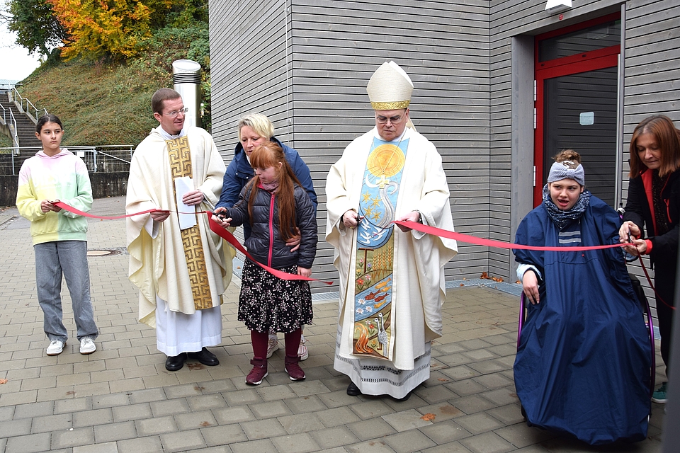 Am Ende des Gottesdienstes zeigt sich der Bischof beeindruckt von der gemeinsamen Messe und dem starken Miteinander in Ursberg: „So unterschiedlich die Schulen, so unterschiedlich die Menschen hier sind, ihr seid doch eine große Familie.“ In einer kleinen Prozession schritten Bischof, Ehrengäste und Schüler dann von der Kapelle St. Florian zum Schulpavillon, wo die Kreuze für die Klassenräume im Freien gesegnet und dann im Zuge der Weihe des Gebäudes durch Bischof Bertram aufgehängt werden.