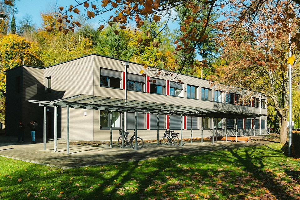 Finanziert wird das rund 3,9 Millionen Euro teure Gebäude von der SoBAInvest GmbH, einer Gesellschaft für soziales Bauen und Investieren mit Sitz in Ursberg. Zunächst werden die Räume an die St. Josefskongregation vermietet, ab 2028 an das DRW. Die Firma Erne GmbH, deren Hauptsitz in Laufenburg, im schweizerischen Kanton Aargau liegt, hat den Bau mit 25 einzelnen Modulen in Holzbauweise geplant und binnen weniger Monate fertiggestellt. Im Gegensatz zu anderen Containerbauten spielt hier der Nachhaltigkeitsaspekt auch eine Rolle. Der Pavillon verfügt über den sehr hohen KfW-40-Energiestandard und ist so konzipiert, dass er vollständig abgebaut und an anderer Stelle wieder aufgestellt werden kann.