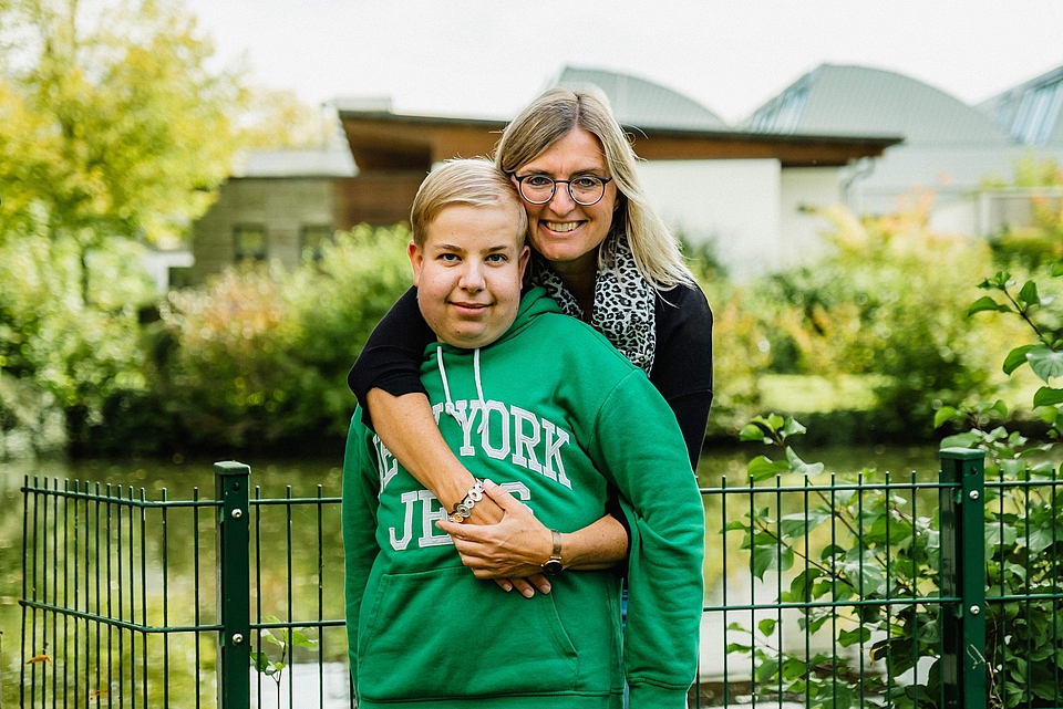 Hannes mit seiner Mutter Stefanie Weizmann im Garten der Heilpädagogischen Tagesstätte in Ursberg