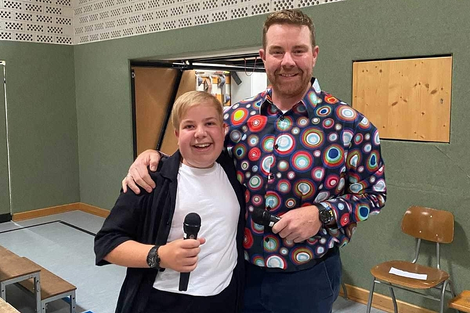 Gemeinsam mit dem stv. Schulleiter Michael Lessmann moderierte Hannes den Bunten Abend an der Dominikus-Schule.