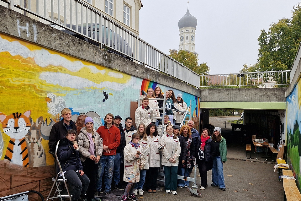 Ursberg, 13. Oktober 2025 – Bereits zum vierten Mal wurde in Ursberg die Fußgängerunterführung beim Dominikus-Ringeisen-Werk zur farbenfrohen Leinwand für ein inklusives Graffiti-Projekt der Dominikus-Schule und des Ringeisen-Gymnasiums. Unter der kreativen Leitung von Sabine Herget (Dominikus-Schule) sowie der Beteiligung von Helmut Ulrich, Sonja Grayer, Margareta Schiegg und Christian Richter (Ringeisen-Gymnasium) gestalteten 18 Schülerinnen und Schüler vom 6. bis 9. Oktober 2025 ein beeindruckendes Wandbild zum Thema „Arche Noah“. Unterstützt wurden sie dabei von den professionellen Graffiti-Künstler von Die Bunten e.V. aus Augsburg.