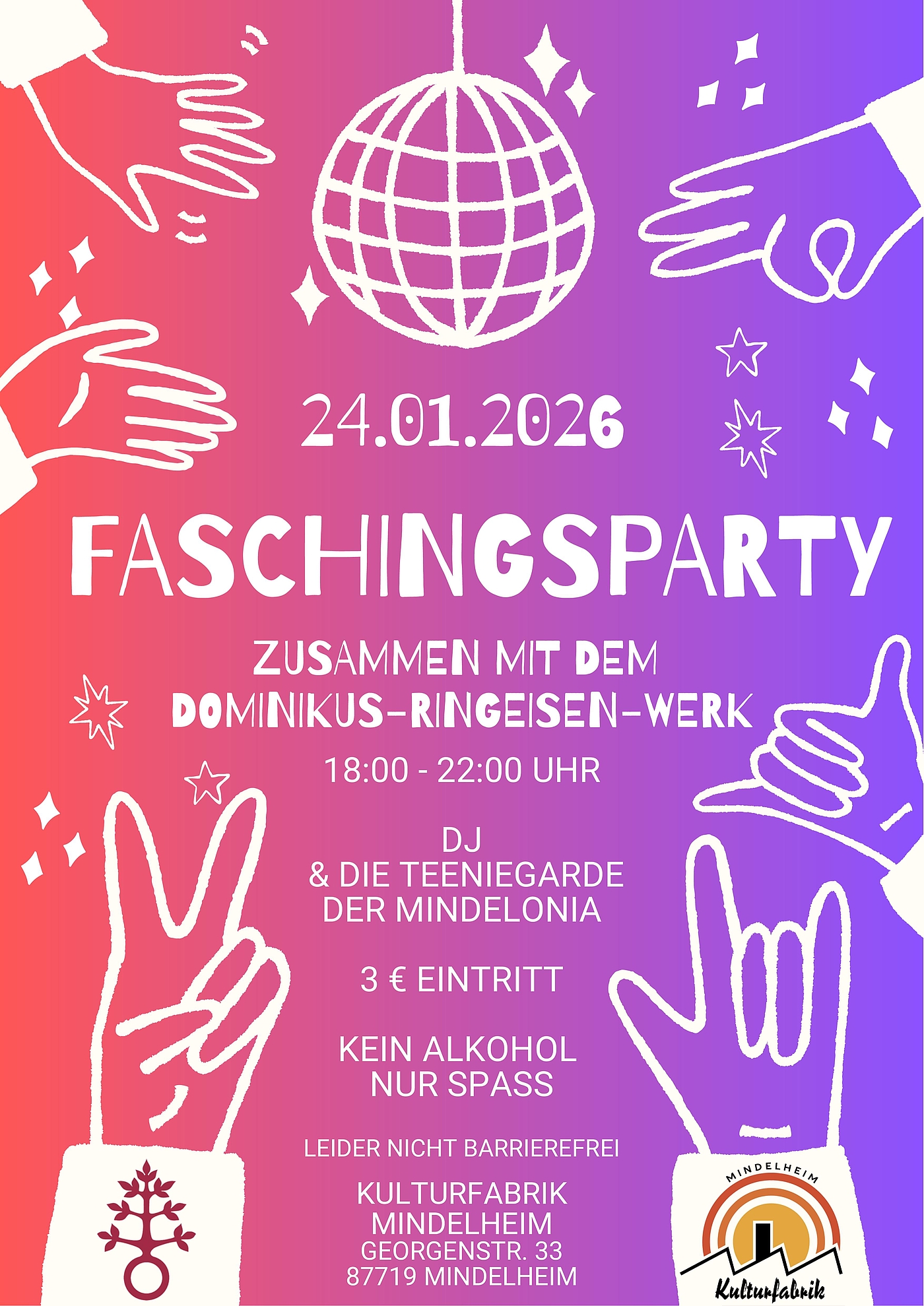 Am 24.01.2026 steigt von 18:00 bis 22:00 Uhr die große Faschingsparty in der Kulturfabrik Mindelheim – gemeinsam mit dem Dominikus-Ringeisen-Werk.