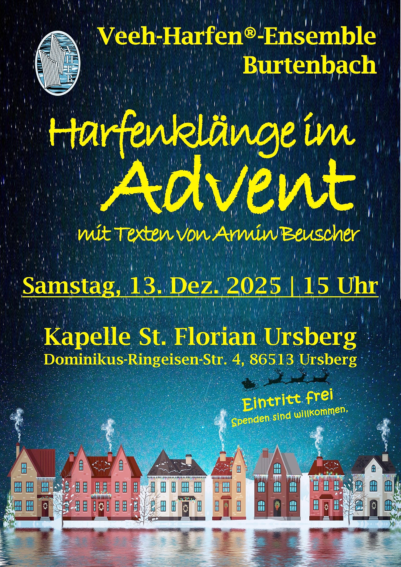 Lassen Sie sich vom Veeh-Harfen®-Ensemble Burtenbach in die besondere Stimmung des Advents entführen. Sanfte Harfenmelodien und berührende Texte von Armin Beuscher schaffen Momente der Ruhe und Besinnung inmitten der Vorweihnachtszeit.