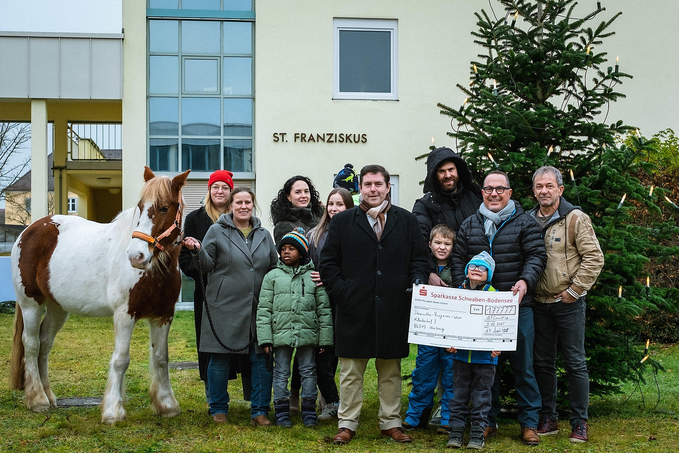 Im Rahmen der Spendenübergabe durften wir die d7-Gründer Frank Frieb und Maximilian Schmid vor Ort in Ursberg begrüßen - begleitet von Kindern aus St. Franziskus, Einrichtungsleiterin Diana Greck und ihrem Team sowie unserem Therapiepferd Biene.